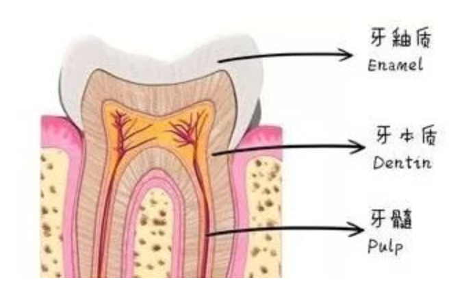 為了解疼痛的根源,有必要了解一下牙的構(gòu)造,牙從外至內(nèi)分別為牙釉質(zhì),牙本質(zhì),牙髓。而牙齦是介于牙齒和牙床之間的組織,來(lái)包圍支撐牙齒。
